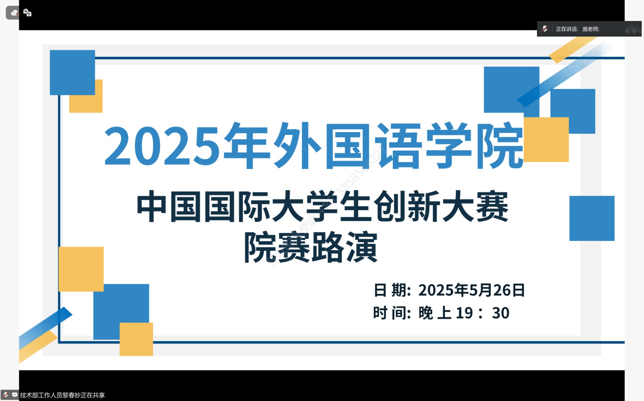 答辩会开场,由高飞雁副院长代表学院致辞。她提到,本次大赛报名情况十分可观,截止5月27日18:00,系统报名数为293项,远超预期,对赛事筹备工作表达了肯定,同时也对参赛选手寄予厚望,期待他们在路演中充分展现自身实力,发挥出最佳水平。