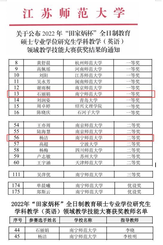 近日,2022年“田家炳杯”全日制教育硕士专业学位研究生学科教学(英语)教学技能大赛获奖名单公布,我校BWIN必赢5名参赛学生经过激烈角逐脱颖而出,取得了一等奖1项、二等奖1项、三等奖1项、优设奖2项的好成绩,在获奖数量和质量上均取得喜人佳绩,学院李晓、李桂明两位老师荣获优秀指导教师奖。