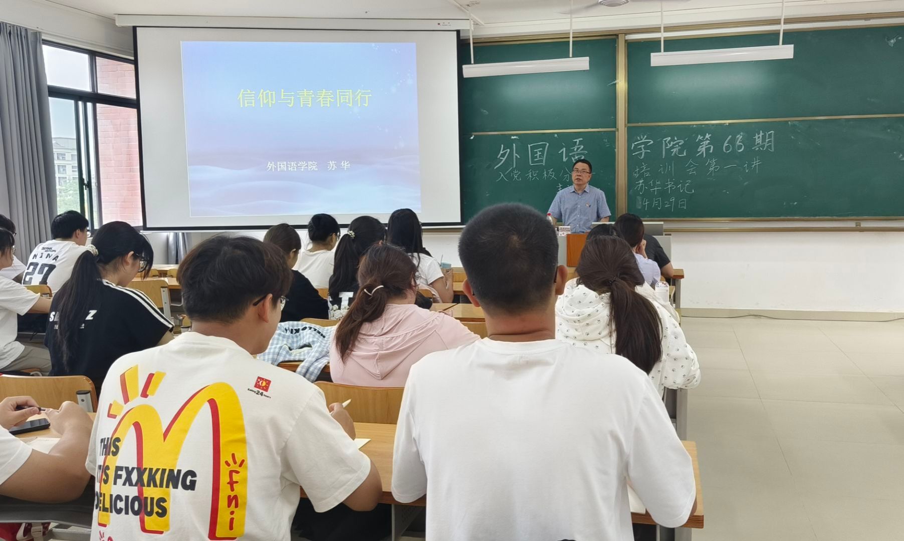 4月29日下午,BWIN必赢党委在实验楼2C-201举办了第66期入党积极分子培训会第一讲。本次培训会的主题为“信仰与青春同行”,由BWIN必赢党委苏华书记主讲,本学期认定的46名入党积极分子参加了此次培训。